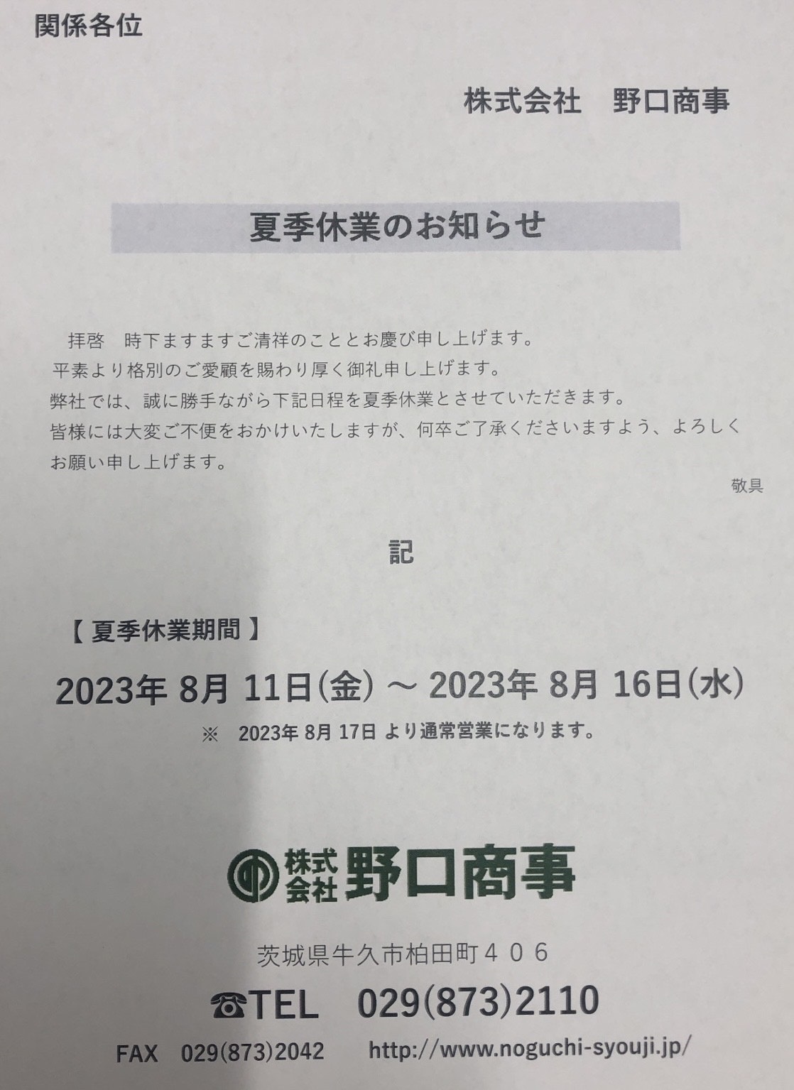代表野口剛志、社員一同より