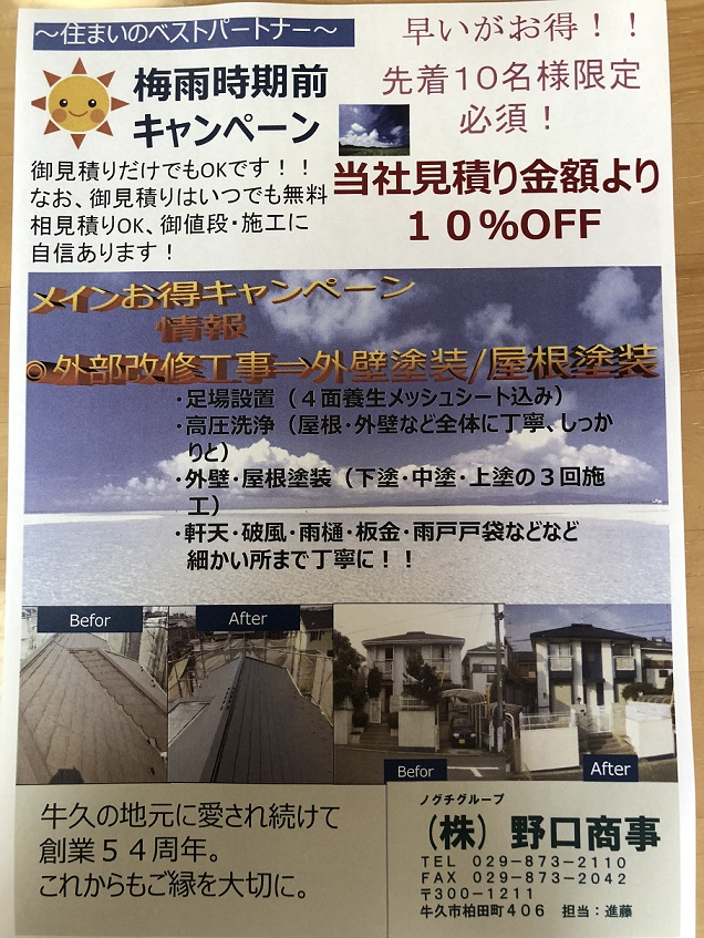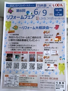 リフォームフェアー・相談会開催 日時:6月9日(土)10:00~17:00 場所:LIXILつくばショールームにて つくば市研究学園5-20-7 リフォーム工事や家づくりご検討の方はもちろん お近くに来た際には ご来場特典盛りだくさんですので是非遊びによってくださいね!! リフォームフェアーのお問い合わせ ㈱野口商事 リフォーム事業部 担当:山本・石神まで 029-873-2110