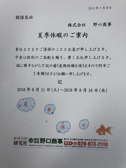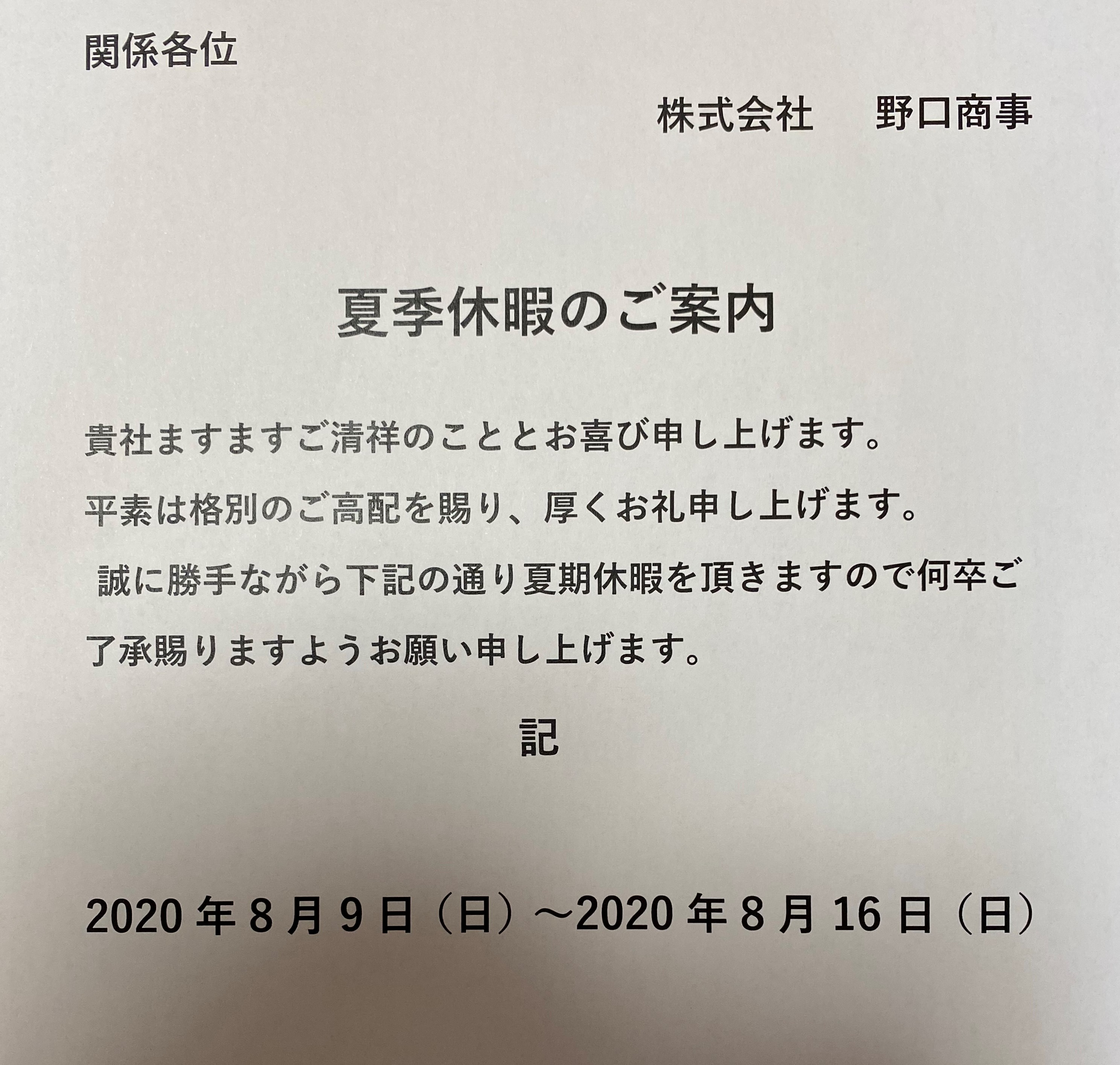 夏季のお休みのお知らせです。 休日中は何かとご迷惑をお掛けすると思いますが 何卒、ご理解、ご協力の程 よろしくお願い申し上げます。 株式会社野口商事 代表野口剛志