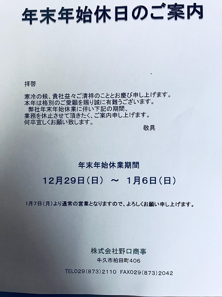 年末年始休日のお知らせ。