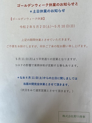 週末営業につきましては、 ゴールデンウィーク明けまで様子を見て その時の県内や牛久市内の状況を確認しながら 通常営業にするか否かを考えていきたいと思います。 何卒ご理解ご協力の程よろしくお願い申し上げます。 株式会社野口商事 代表野口剛志